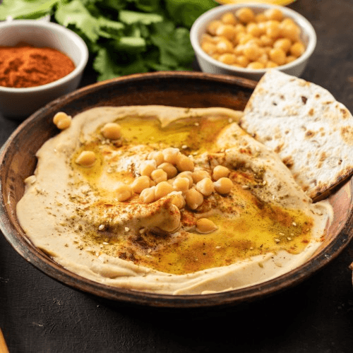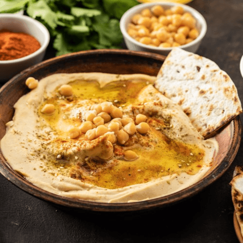 Tasty garbanzo bean dip with freshly made pitas chips or pita bread on the side