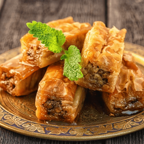 Homemade middle eastern pastry with layers of buttery filó dough with cinnamon, sugar, chopped nuts & sweetened with caramelized syrup. It is a heavenly treat to eat