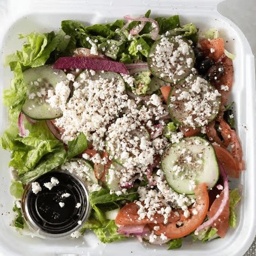 Pita's most popular salad. Our Mediterranean salad is a combination of romaine lettuce, tomatoes, red, onion, cucumbers, kalamata olives, and feta cheese topped with olive oil dressing