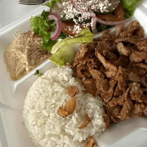 Our signature flame-broiled lamb served with almond topped rice, hummus, and a Mediterranean salad