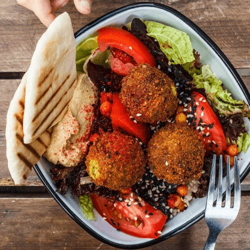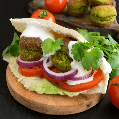 Lightly spicy vegetarian bean patties are flash fried and topped with tomatoes, cucumbers, red onions, tahini sauce, pickles and pickled turnips