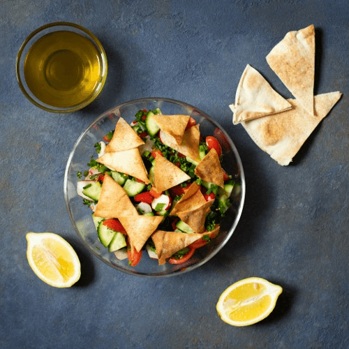 Freshly chopped tomatoes and cucumbers tossed in a coating of lemon juice and olive oil topped with pita bread bits