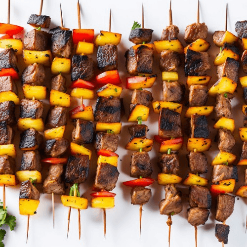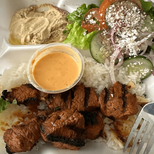 Two skewers of our mouth watering marinated steak cooked to perfection over an open flame, served with almond topped rice, hummus, and a Mediterranean salad