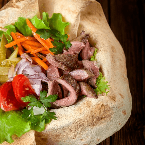 Veggies: your choice of lettuce, onions, tomato, cucumber, pickles, olives, turnips, fattoush, tabouleh, red cabbage, feta cheese. Sauces: hummus, tahziki, spicy tahini, roasted tomato, tahini, garlic, jalapeno, baba (egg plant)