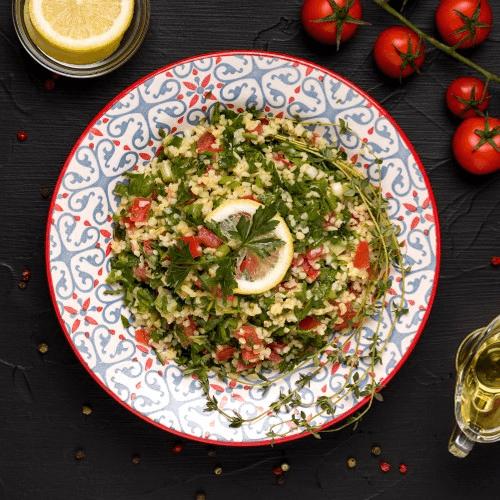 Freshly chopped parsley and cracked wheat tossed with diced tomatoes and cucumbers